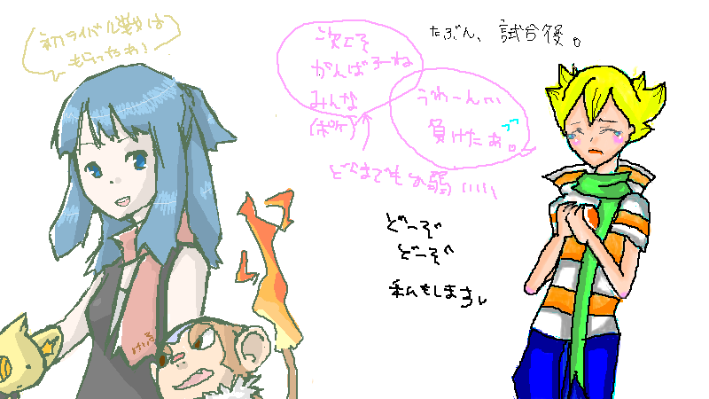 どちらも画面右がアスカ様、左がaro(ポケチャでは慧流って名乗ってるんです。高校いったら慧流で統一しようかと)です。けいりゅうじゃないよ、けいるだよ!